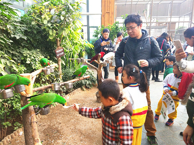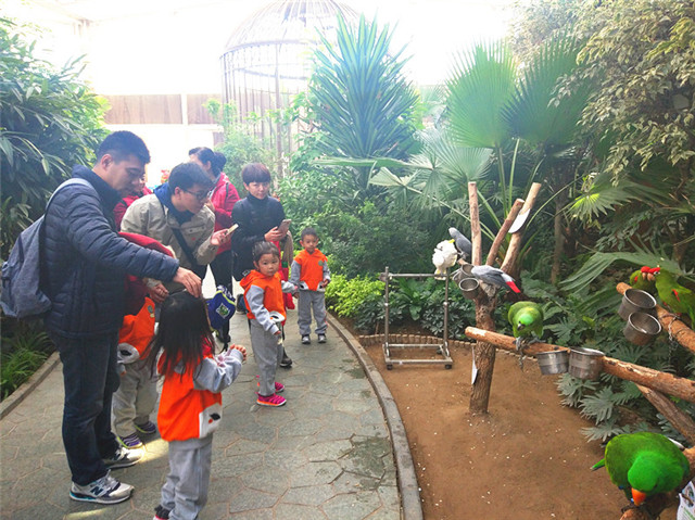 鹦鹉园内展示了近百种鹦鹉,其中有珍贵品种40多种,700多只颜色各异,体态不一的鹦鹉嬉戏于园中,还有最名贵的国家保护鸟类金刚鹦鹉、非洲灰鹦鹉、吸蜜鹦鹉等。中大班的宝贝们带着寻宝任务找寻鹦鹉,并与可爱的鹦鹉合影。宝贝和家长与鹦鹉亲密接触,亲身体验鸟是人类的朋友。