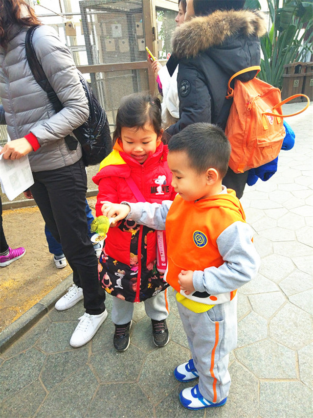鸟是人类的好朋友,宝贝们在园内和鹦鹉亲密互动,细心地喂鹦鹉食物~