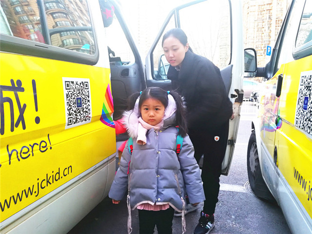 校车司机把宝贝安全送达幼儿园,随车的老师一一牵手宝贝下车