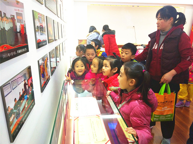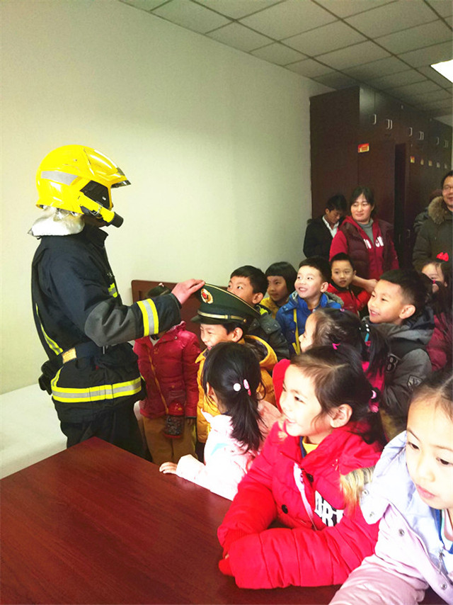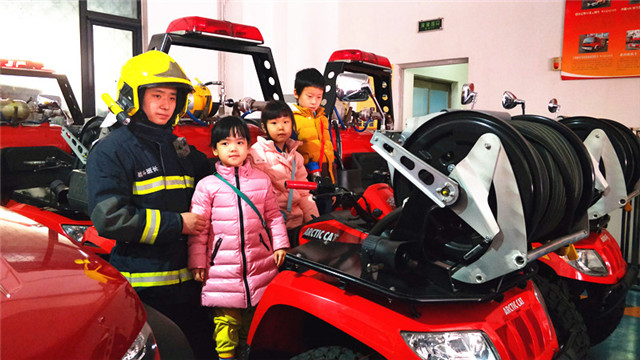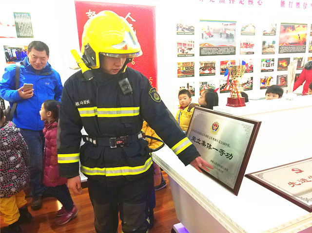 消防员叔叔骄傲地向宝贝们介绍这些荣誉的意义