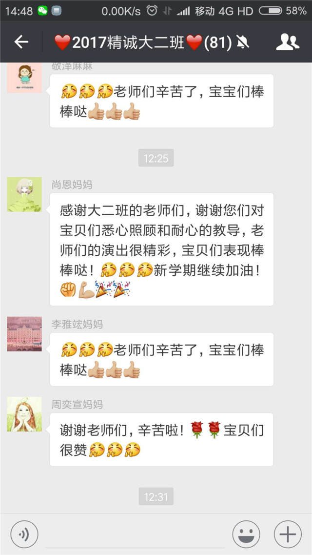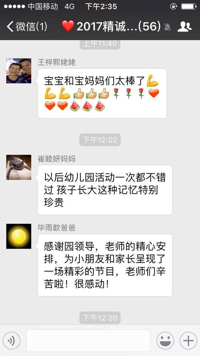新年联欢晚会在全场师生的歌声中圆满结束了,到场的家长们为精诚的宝贝和全体老师们报以热烈的掌声,这掌声是对老师们辛勤付出的肯定,是对幼儿园工作的认可。大家纷纷拍照留言朋友圈,感谢幼儿园对宝贝们精心地培育,点赞今天所有精彩纷呈的节目。
