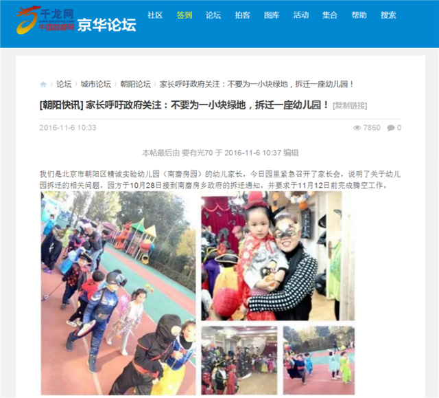然而,2016年10月下发的《关于印发南磨房乡化工路沿线(南磨房段)拆迁工作方案的通知》却将刚刚走出失学阴影的南磨房园的孩子们和刚刚走出失业囧境的老师们再次推入迷茫。全体家长奔走呼吁,教师们签名请愿……《偌大的北京城竟容不下一架滑梯》、《近百孩子入托难住了家长》、《不要为一小块绿地,拆迁一所幼儿园》……媒体报道纷至沓来,一时间这所幼儿园再次成为社会关注的焦点。