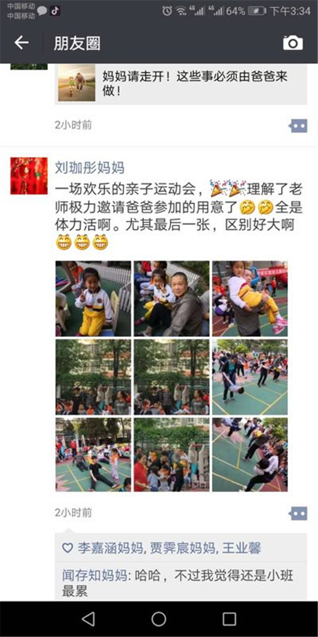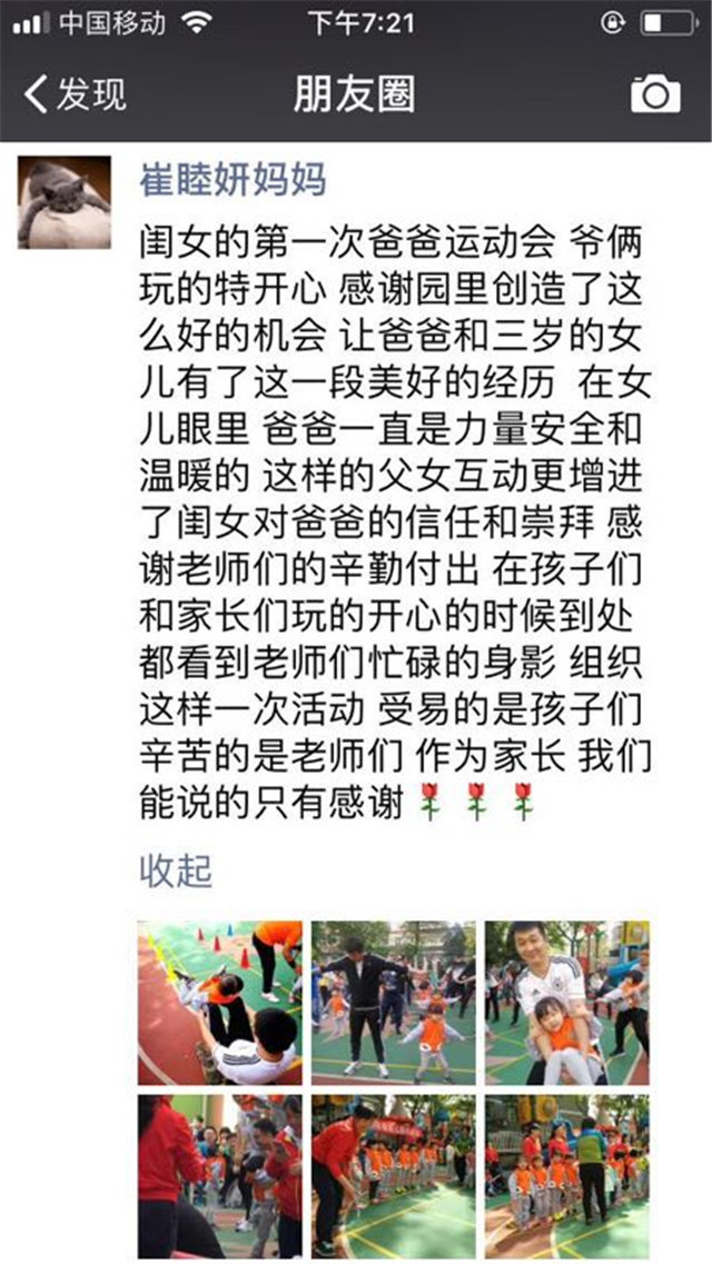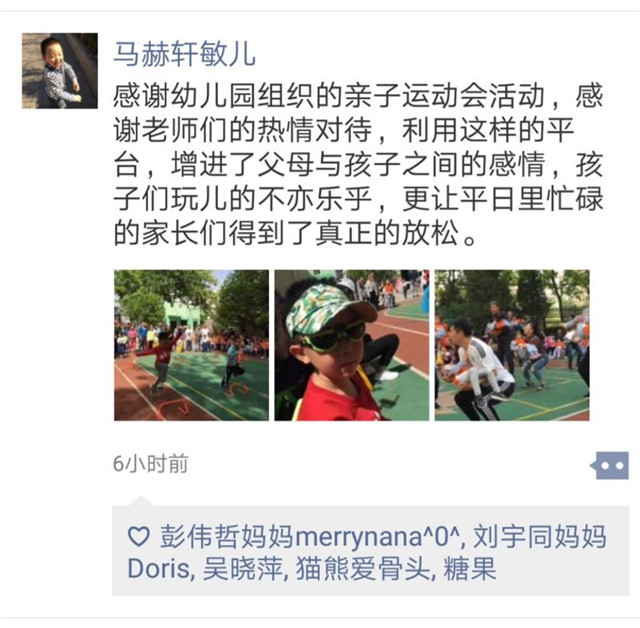 亲子运动会结束后,家长们纷纷把运动会精彩内容上传到朋友圈,感谢幼儿园老师辛勤付出,分享着亲子运动的快乐。