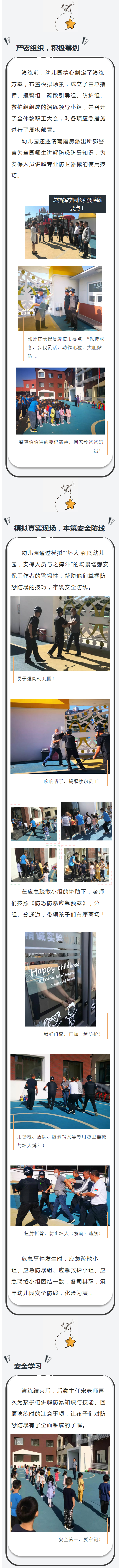 此次防恐防暴演练,检验了幼儿园安全防范工作的实效性,提高了教职工防范、自救、合作的意识和能力,给全体师生上了一堂生动的“生命教育”课,也为幼儿园开展安全工作奠定了扎实基础。