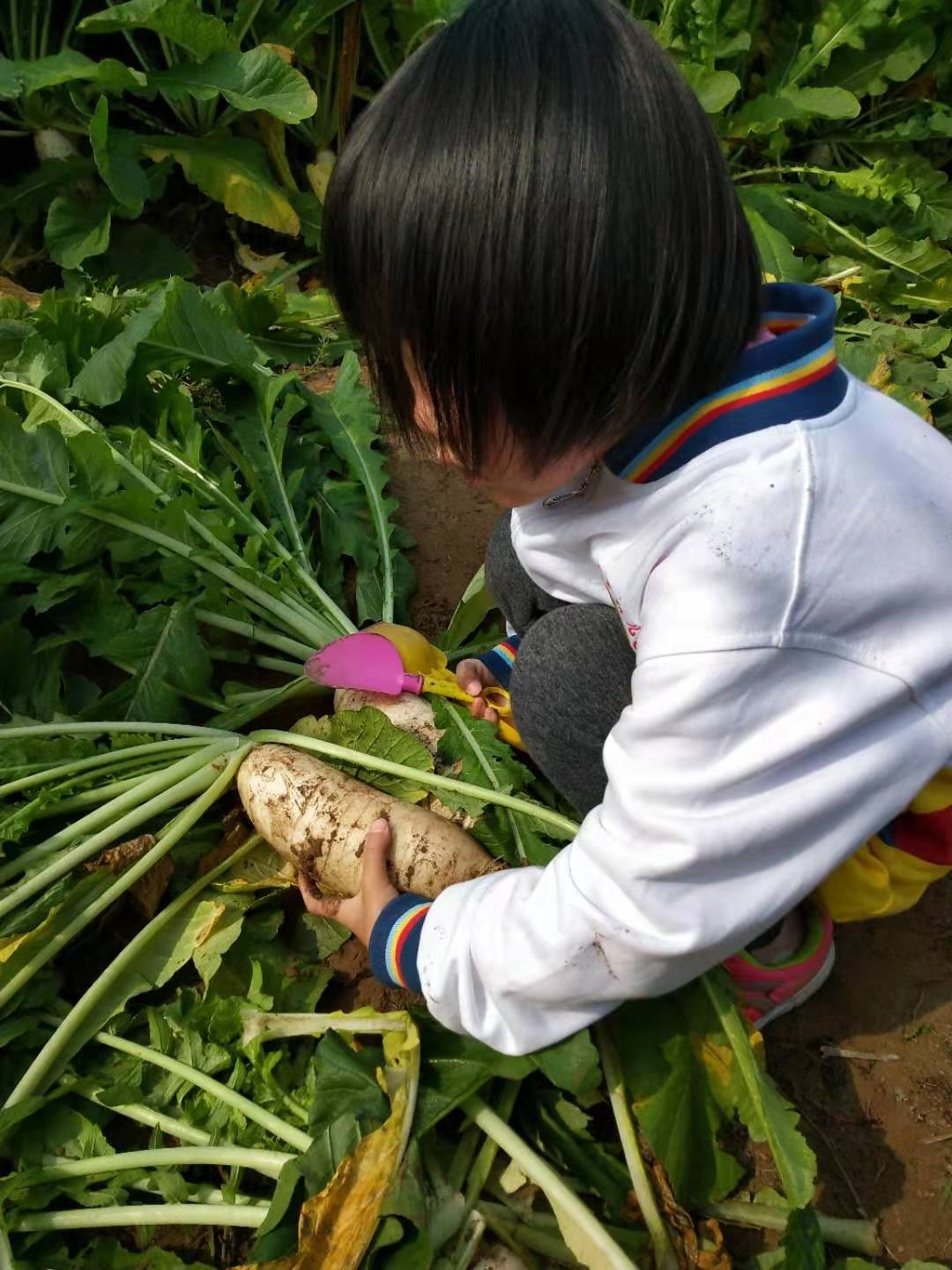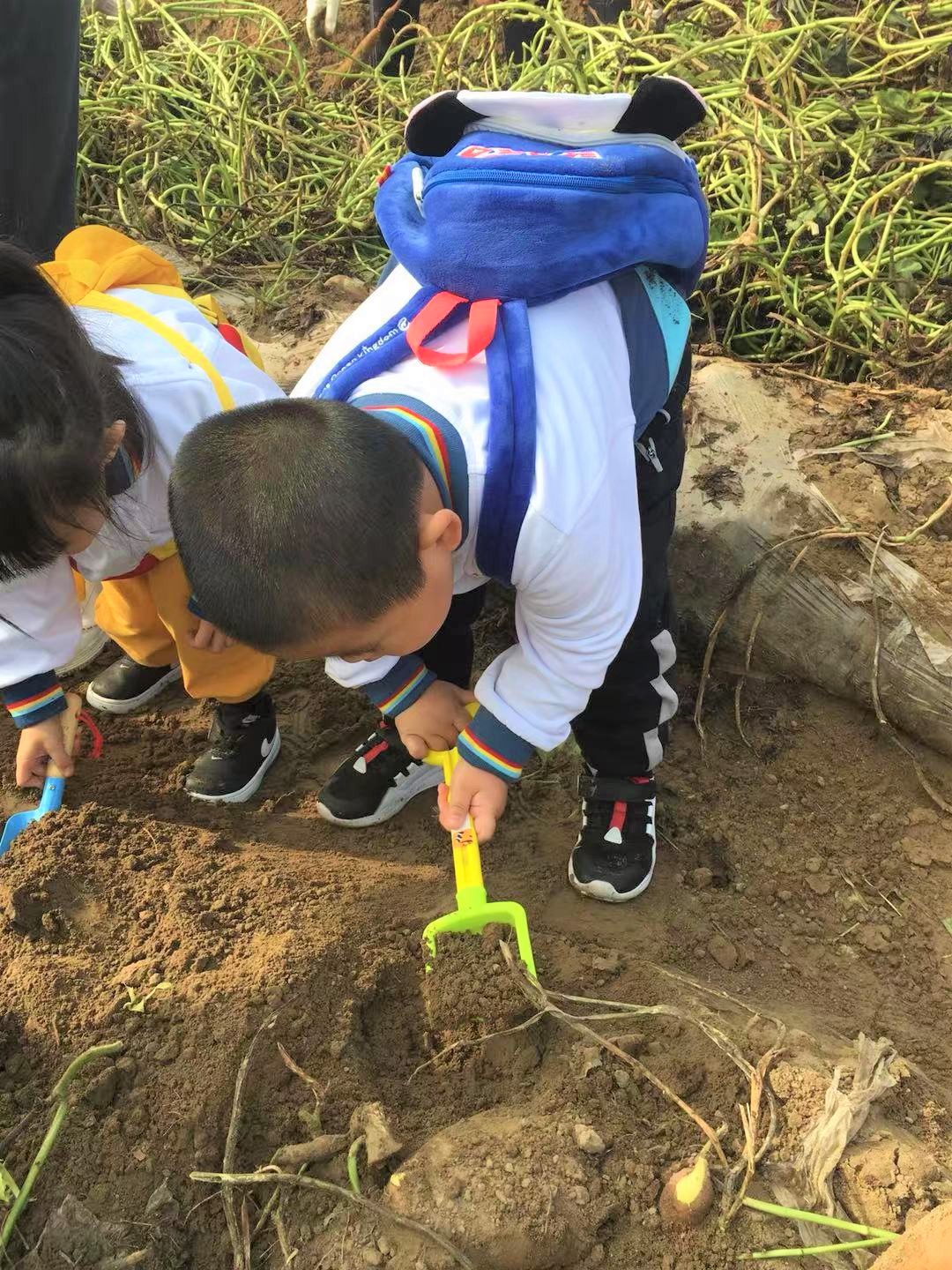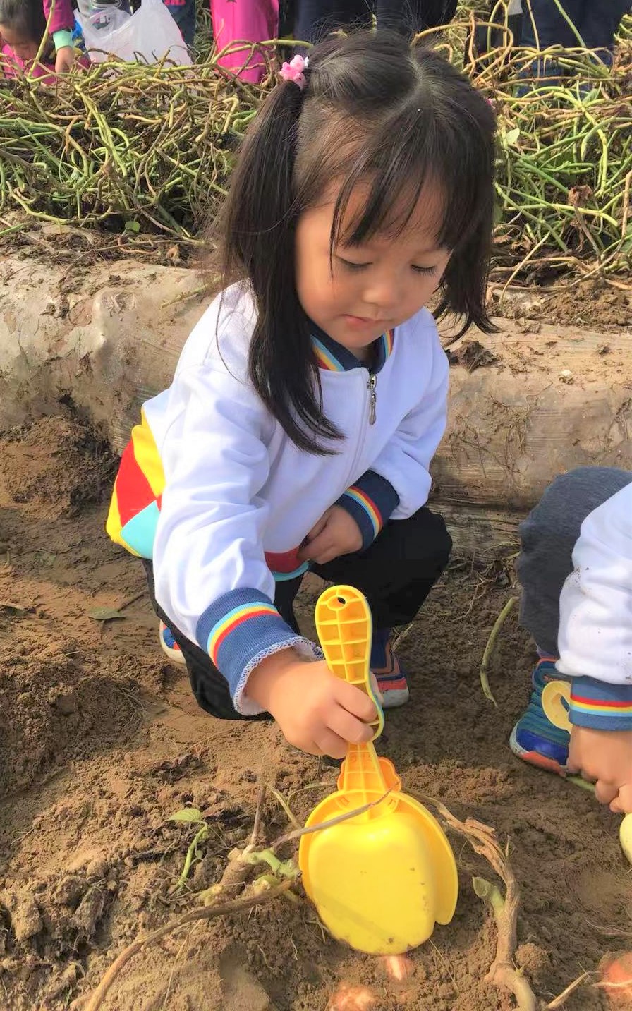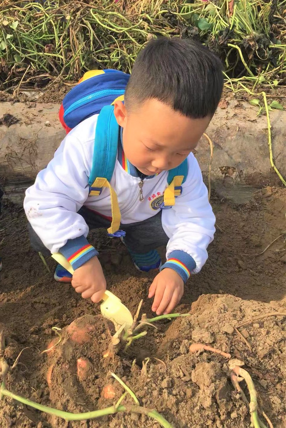 先用小铲子刨土,找到红薯;再用小手使劲拔,还可以与其他小朋友合作哦。