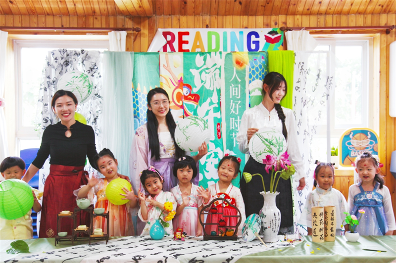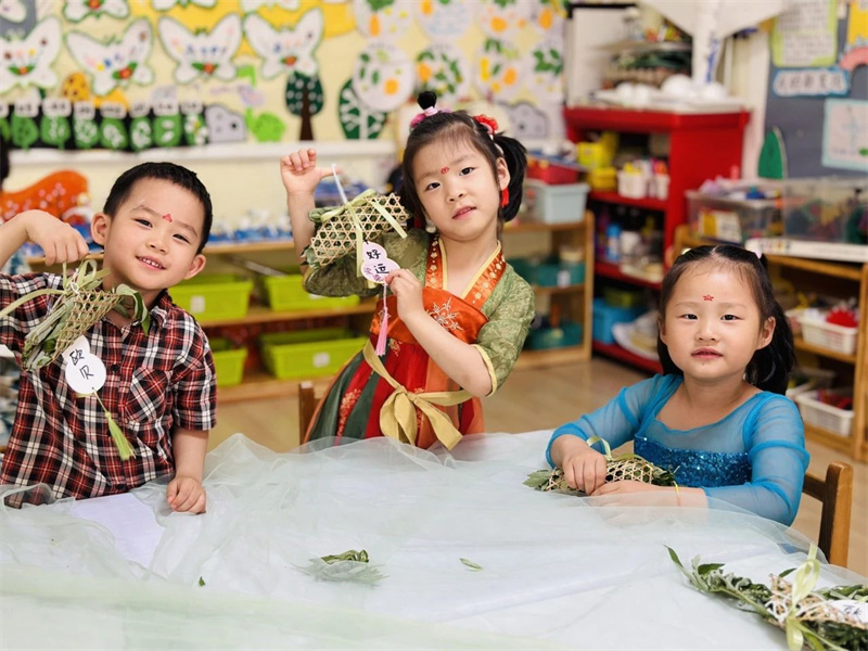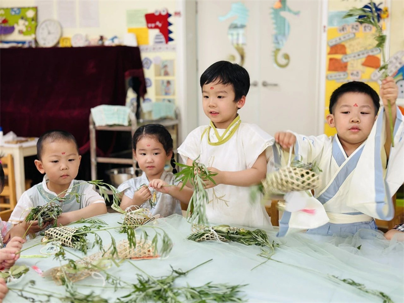 端午与六一撞出双重欢乐,孩子们身着传统服饰,额间朱砂点染,围坐一起体验端午习俗。翠绿艾草点缀竹编篮,粽叶在稚嫩指尖翻飞成五彩挂件。