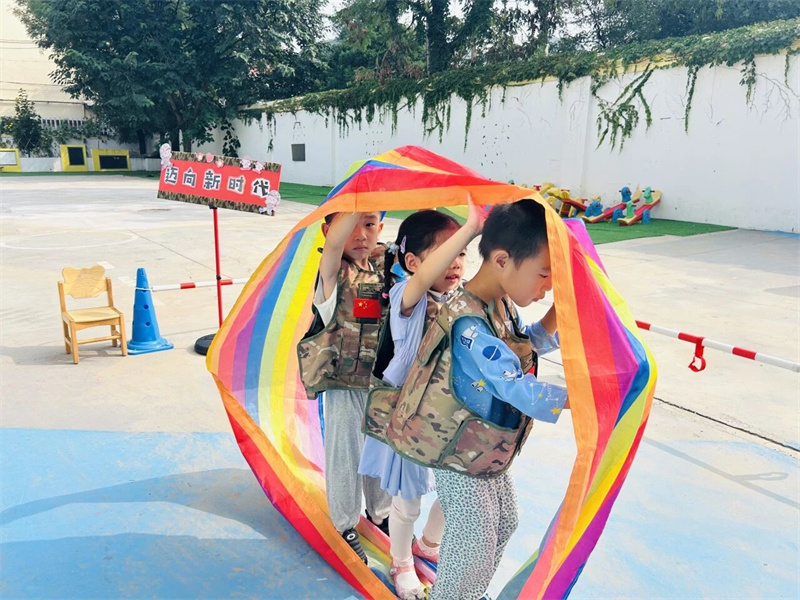 典礼以庄严的升旗仪式开场,小小护旗手目光坚毅、步伐铿锵,亲手升起五星红旗。全场师生与家长行注目礼、齐唱国歌,嘹亮的歌声满是对祖国的敬爱;孩子们领取专属手环,与家长携手贴近“点亮中国”签到墙感应区。瞬间,巨幅中国地图渐次点亮,汇聚成璀璨红色星河,家国情怀在亲子互动中悄然生根;军事体育游戏环节将气氛推向高潮,孩子们化身勇敢小战士,在“运军粮”中磨炼坚韧,于“炸碉堡”里感受无畏,在“飞夺泸定桥”时学会勇敢,于“救护站”中懂得关爱······