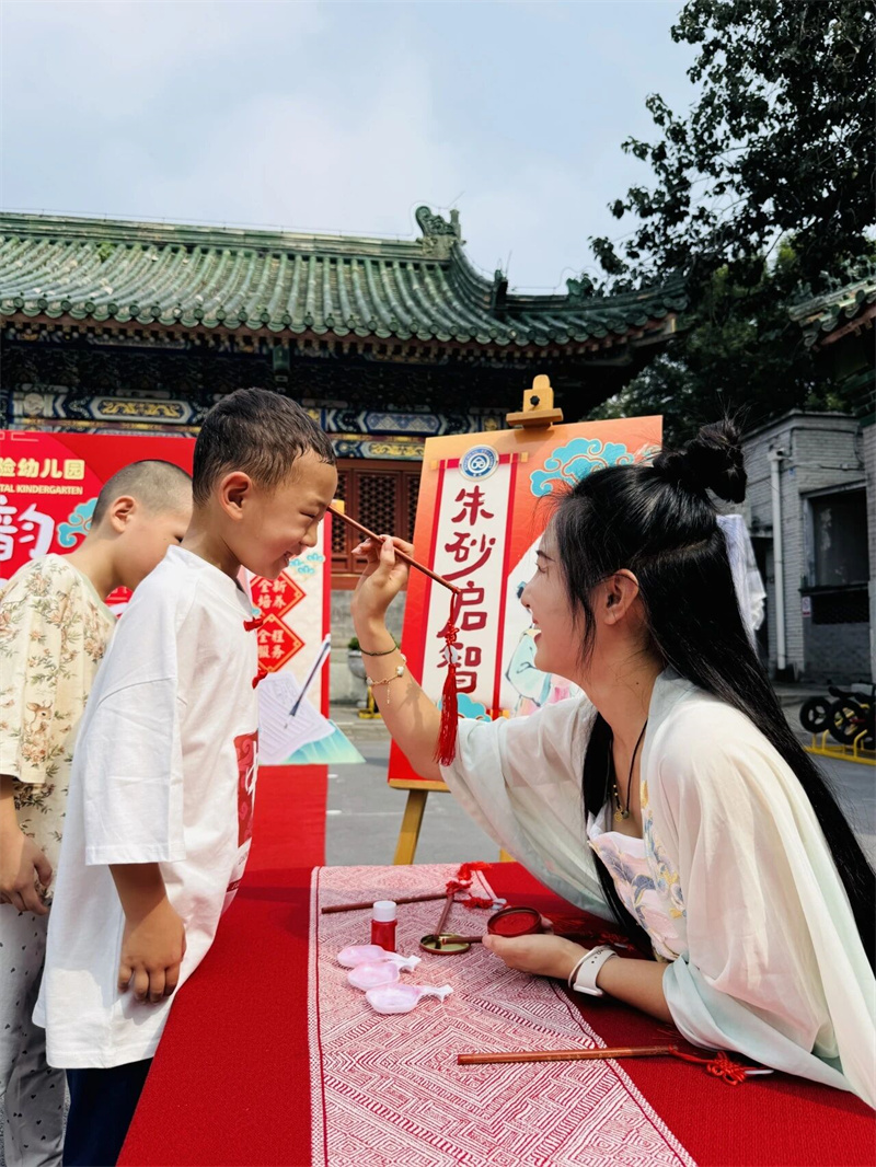 孩子们在“朱砂启智”中颔首受痣,一点嫣红启明心智;借“击鼓明志”,声声铿锵立下远大志向;通过“开笔破蒙”,一撇一捺书写人生第一字;行“沃盥礼”,净手静心,以示对学问与师道的敬畏;开心“摸好彩”,触摸吉祥之物,寄语新学期福慧双增。