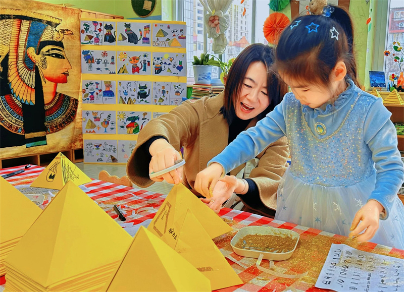 非洲区域的神秘氛围里,孩子们开启跨越时空的文化奇旅。搭建自制金字塔,在一块块积木的堆叠间,触摸古老文明的神秘脉搏;披上埃及服饰,仿佛穿越千年,感受古埃及的庄重与华美;非洲鼓体验中,激昂的鼓点如心跳般有力,孩子们随节奏尽情摇摆,释放无限活力,领悟非洲大地对生命的热烈礼赞。