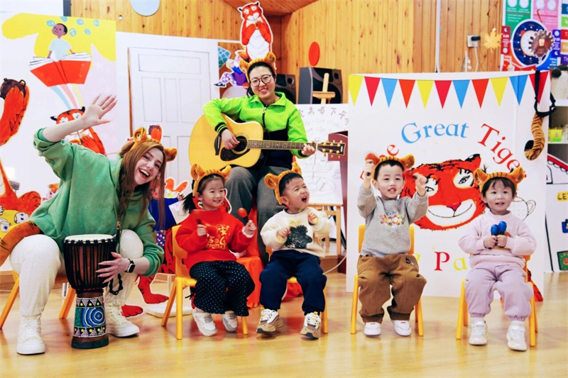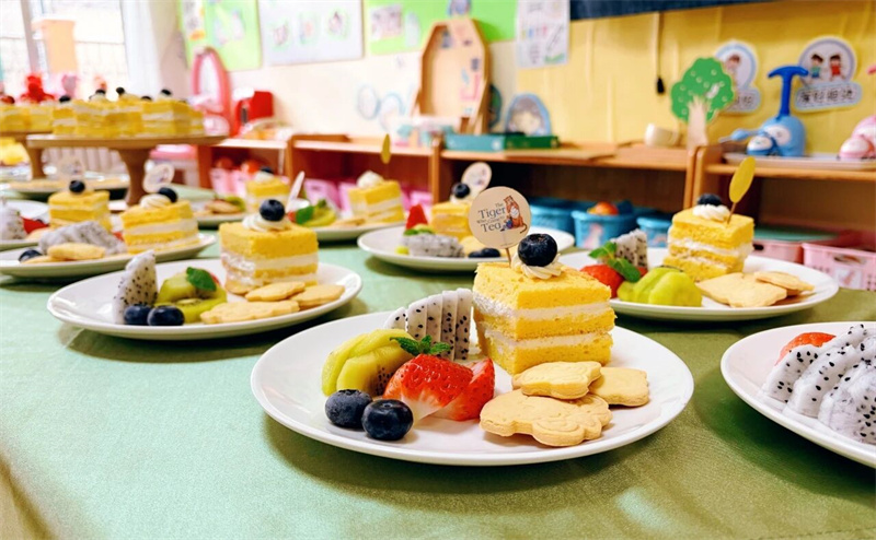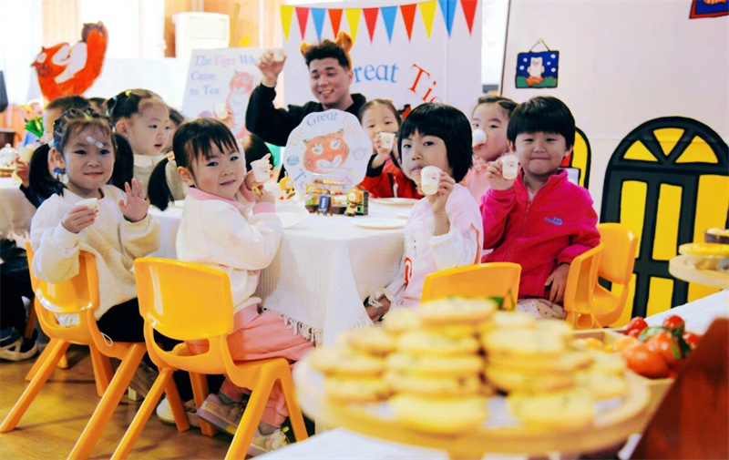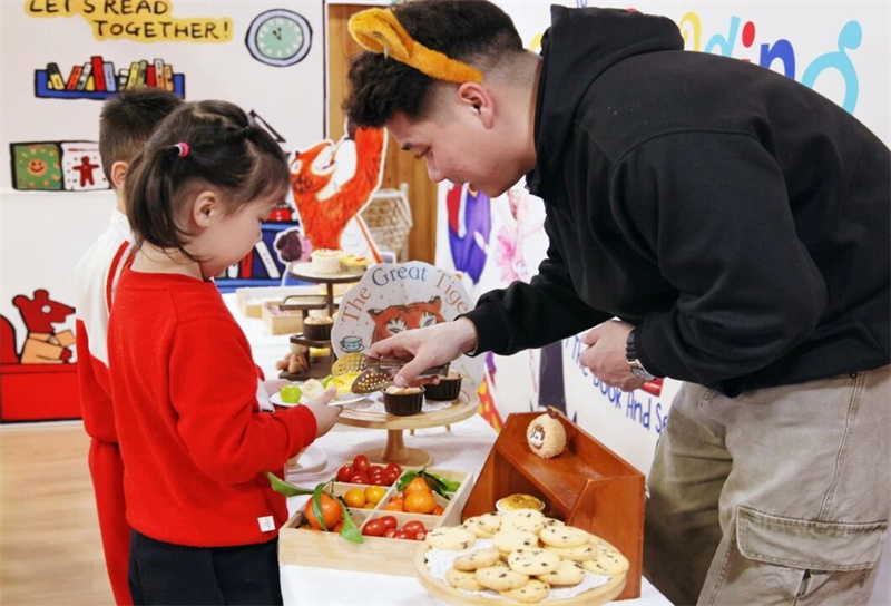 “Because of love,We are generous in sharing;Because of courage,We embrace the unexpected!” 在外教专业又童趣的引导下,孩子们走进世界级经典绘本《老虎来喝下午茶》的奇幻天地,在全英文沉浸氛围与立体生动的场景加持下,聆听故事、体悟细节,更与外教携手演绎剧情、沉浸式互动共创,于深度参与中挖掘故事内核要义,让语言感知与运用能力在潜移默化中自然进阶。随后的音乐绘本派对,让故事与旋律完美交融。孩子们随节奏律动释放天性,在双语互动吟唱中深化故事共鸣,更同步强化语言表达与艺术表现双重能力。温馨的下午茶聚会则将故事情境生动延伸,孩子们化身故事角色分享美食、友好互动,在真实的社交场景中涵养礼仪素养,真切感受分享的温暖与包容的力量。