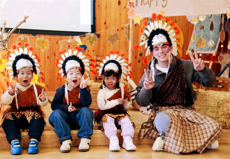 “Let's be thankful for our friends and family, grateful for the air that we breathe, and appreciate everything that we have today!”循着多元文化足迹,外教带领孩子们走进经典绘本《Pete the Cat》,解锁感恩与分享的主题。沉浸式故事场景里,外教以互动式引导带领孩子们解锁剧情脉络、体悟故事深意,锻炼沟通与语言理解能力;苹果派制作环节将故事内涵融入实践,全英文语境里,孩子们认识食材、协作实操,体会劳作的艰辛与收获的喜悦;美食分享会上,外教以故事情节为示范,引导孩子们用英文表达分享心意,把感恩化作行动,涵养社交素养;印第安音乐派对上,孩子们和外教一同律动吟唱,感受多元文化魅力,深化跨文化认知与表达能力。