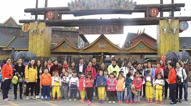 孩子与家长们小手牵大手,走在葡萄架下,不知不觉地慢了下来,静静的去欣赏着这里独有的热带风情。“别具一格的图腾,奇形怪状的木雕;异域风情的土司堡……”,使孩子们仿佛走到了一个奇幻的世界,而孩子们对周围的一切都充满了好奇。