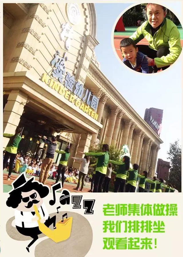 北京精诚实验幼儿园南磨房园的比赛接近尾声,老师们为全体幼儿展示了第八套广播体操,孩子们排排坐,看得聚精会神。