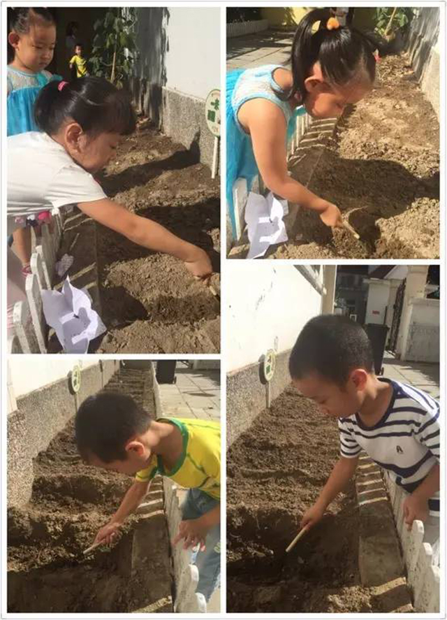 老师带着孩子们从翻土开始管理小朋友们自己的菜园,一起动手、观察、记录,让孩子了解与关注蔬菜的生长,培养孩子的观察力,亲自参与并体会蔬菜生长的变化过程。